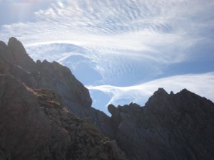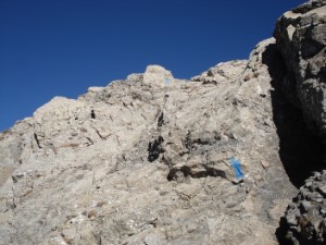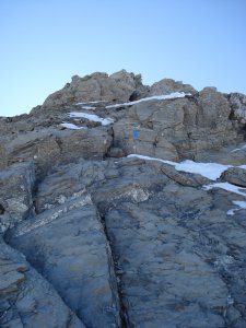 Ab dem Vorgipfel folgt die Route mehr oder weniger der Gratschneide, es geht zuerst einige Meter runter. Es gibt reichlich Markierungen, manchmal muss man aber genau hinschauen. Einge Grataufschwünge werden überklettert (I, gute Griffe und Tritte), ein paar kurze Stücke balanciert man auf dem Grat direkt (ich fand hier die Skistöcke nicht unpraktisch), manchmal quert man durch die rechte Flanke über schmale Schuttbänder. Es gibt keine Sicherungen und auch kaum Sicherungsmöglichkeiten, da das Gelände neben dem Grat eher lose ist. Schwierigkeit T4/T5, etwa 30 Minuten.