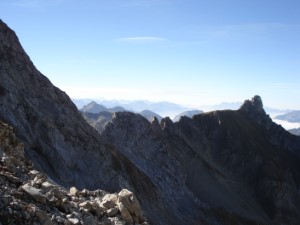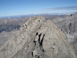Nach einer kurzen Querung mit Drahtseilen bin ich am Oberen Sättele und kann endlich den Weiterweg durch die Westflanke sehen: gute 60 Höhenmeter abwärts über Schuttfelder queren, danach ist wieder ein halbwegs vernünftiger Weg zu erkennen. Er führt einen steilen Grashang im Zickzack aufwärts und verliert sich dann in einer felsig-grasigen Flanke; es gibt aber reichlich Markierungen. So geht es bis zum Vorgipfel (2620 m). Ein paar Bergsteiger kommen mir entgegen, aber es ist überall genügend Platz zum Ausweichen. Das Stück bis zum Hauptgipfel bietet dagegen eine halbe Stunde lang einiges an Querungen, kurzen Kletterstellen und Balancierstellen auf der Gratschneide.