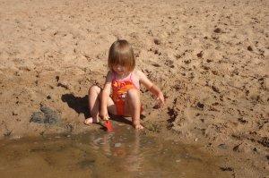Jetzt wird es flacher, durch eine weitläufige Tallandschaft fahren wir über Leutershausen nach Herrieden (Mittagspause, Gaststätte, aber leider kein Spielplatz) und weiter nach Großenried (endlich ein Spielplatz, wo Nina aussteigen und eine Stunde lang herumtoben kann). Nach einer weiteren Stunde Fahrzeit sind wir am Altmühlsee und können noch eine Stunde Badepause einlegen.
