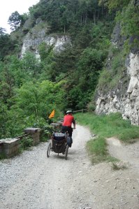 Die Straße ist bis 1400 m geteert, ab dort nur ein Feldweg. Ganz am Ende gibt es auch noch eine Querung, bei der man zeigen kann, ob man genau weiß wie breit der Kinderanhänger ist...
