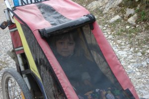 Da uns für den heutigen Tag keine passenden Wanderziele einfallen, unternehmen wir eine Radtour zum Refugio Pernici. Das liegt auf der anderen Seite des Bergkamms über der Malga Grassi (siehe letzter Dienstag). Wieder ist uns der komplette Anstieg per Fahrrad (mit Anhänger) von Riva zum Lago di Ledro ein bisschen viel, so starten wir jenseits des Lago di Ledro in Lenzumo (793 m).