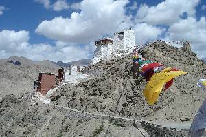 First northbound along Tsomoriri, crossing the small pass Pass Nusgur La (4830 m) into Raldong valley. The landscape is changing from desert-like high plain to an equally desert-like river gorge - only along the river a few tamarisk trees are growing. The first part of the road is a bad cart track, the rest is mostly paved and quite ok. After two hours (54 km), we meet the Indus River coming from the right, the road is now really good. For 110 km we follow Indus downwards in a magnificient gorge with rock formations worth viewing. Again and again we encounter bad stretches where the road was only prosivionally repaired from the damages of severe weather in beginning of August. After we joined the Manali-Leh Highway, the road even has a complete lane for each direction, giving enough space to oncoming traffic. The final 50 km to Leh are done quickly.