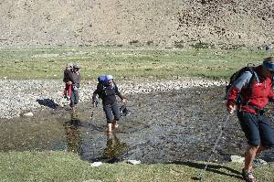 From the pass (5449 m) on, we follow a small, narrow valley down, with a view to Tsomoriri. It soon widens to a desert-like plain which we cross for boring 4 kilometers. After another narrows we reach (4540 m), the largest (and, except for military bases, the only) village at Tsomoriri. A lot of construction work is going on: The road is being paved. We stay for the night on one of the campgrounds in the village. We conclude the trek with a short walk to the lake shore. Also Tsomoriri is not noticeably salty, and the water temperature is fresh but not daunting.