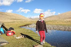 The night was colder than in base camp, but here the sun reaches the tent at six o'clock. Heute Marion, Henning and Rigzin go to P.6100. We have a walk around ABC, but Nina is not very enthusiastic about hiking. But she is keen on diverting the icy stream near ABC, standing in the water barefooted. The three return successcully from the mountain at 2 p.m. The rest of the afternoon consists of recreation, but mostly within the tent - outside it is time and again windy and uncomfortable.