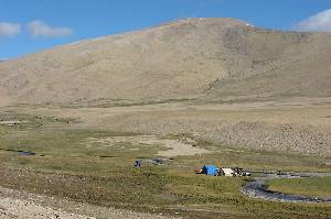 On a mostly very good road we cross Taglang La (world's second highest motorable pass, 5350 m) into a shallow high valley. Short rest in a tea tent along the road. After a few kilometers, a rather bad cart track is leading towards Tsokar (White Lake). Inspection and taste test of the salt deposits; besides salt there are also a few sulfur crystals. The track continues along the shore and through a desert-like plain until Nuruchang (4690 m) where our starting camp for the trekking is situated. Since we arrive already at noon, we have time for small afternoon hikes. Claudia, Nina, Marion, and Henning walk up the hill north of the camp; I go southwards, following sustained grass ridges to Horlam Kongka Ri (5215 m, according to the map 5180 m). When the sun has disappeared in the evening, it becomes cool quickly. For dinner, now long underwear is used.