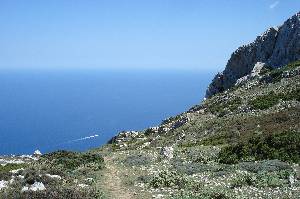 Montag, 16.05.Mola de s'Esclop (928 m) Westanstieg (Hartmut) / Ruhetag (Claudia, Nina)Claudia und Nina gehen heute ans Meer; ich möchte heute nach dem Weg suchen, dessen Ausgangspunkt wir gestern nicht gefunden hatten. Am Coll de sa Gramola gibt es einen großzügigen Parkplatz. Der GR-221 ist ab hier etwa 2 km der Straße folgend eingezeichnet. Für Nina wäre das entschieden zu langweilig gewesen, alleine habe ich die Strecke nach 20 Minuten hinter mir. Der Wanderweg zweigt bei km 105.9 ab. In einem kleinen Tal ist er noch gut zu sehen, wird aber bald undeutlicher. Die Markierung ist ziemlich sparsam, daher verpasse ich auf dem Felsrücken immer wieder die Ideallinie. Bald kommt ein Zaun mit einer Leiter; spätestens hier wären sowieso alle Varianten wieder zusammengelaufen. Mittlerweile erkenne ich den richtigen Weg daran, dass es dort etwas gelblich-bräunlicher ist als in den Felsen drumherum. Nach einer Rinderweide mit Bäumen - eine schön grüne Landschaft - kommt ein zweiter Zaun mit Leiter. Im Wald ist die Route nur schwer zu finden; es geht auf eine Felswand zu, verbrannte und umgefallene Bäume machen die Orientierung zusätzlich schwierig. Irgendwie den Durchstieg über die Felsstufe gefunden, noch ein paarmal die Route verloren, aber nun wird das Gelände frei und übersichtlich. Die Wegspur wird auch allmählich besser; unterm Gipfel erreiche ich bekanntes Terrain und nehme den Weg, den ich von gestern her kenne. Zwei Stunden von der Straße bis zum Gipfel, die Höhenmeter sind vergleichbar zu gestern. Den Weg zurück kenne ich jetzt ja schon, von oben ist die Strecke auch etwas besser zu erkennen. Kurz vor der Straße im Gehöft Ses Fontanelles kann ich mir ein Bier gönnen, bevor wieder die 2 Kilometer Straße hoch zum Pass zu absolvieren sind. Vom Pass aus erkunde ich noch ein wenig die Wanderung Richtung La Trapa ([Hikeline]8), aber das sieht eher nach langweiliger Fahrstraße aus.