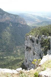 Gegenüber dem ursprünglichen Flugplan (Abflug 7 Uhr) hätten wir heute noch recht viel Zeit zum Packen gehabt, denn unser Flug geht erst nachmittags um drei. Die Taschen sind aber ohnehin schon seit gestern gepackt. Sonntag, 15.05.Mola de s'Esclop (928 m) Nordanstieg (Claudia, Hartmut, Nina)Das Wetter ist nicht allzu heiß (etwa 20°C), teils bewölkt, teils sonnig. Gutes Wanderwetter also. Wir nehmen uns die Mola de s'Esclop vor, neben dem Galatzó der zweithöchste Berg hier im Süden der Tramuntana. Auf der Landkarte ist eine Etappe des Weitwanderwegs GR-221 eingezeichnet, auf dem man den Berg eigentlich von Westen her erreichen müsste. Wir finden aber keinen geeigneten Parkplatz und fahren daher zum üblichen Startpunkt bei km 97 der MA-10. An der (anscheinend immer noch nicht offenen) Hütte sa Coma d'en Vidal vorbei erreichen wir den Coll des Quer unterhalb der Gipfelaufbaus. Von der Finca Galatzó her sind offenbar viele Leute unterwegs (Franzosen, Spanier, Einheimische). Nina ist schon ein wenig müde von dem eintönigen Aufstieg, sie kann sich nicht so recht für die letzten zweihundert Höhenmeter motivieren - wo die doch die interessantesten sind. Aber nach einer Pause und einigen Gummibärchen ist das letzte Stück kein Problem mehr. Zweieinhalb Stunden sind eine gute Zeit. Ich wähle für den Abstieg die Westseite, dort ist ein Pfad durch die Felsflanke zu erkennen. Dorthin sind auch die Spanier verschwunden, die mit uns am Gipfel waren. Der Weg ist einfacher als unser Aufstieg; bald treffe ich auf den GR-221 und kann nördlich um den Berg herum zurück zum Coll des Quer queren, wo ich Claudia und Nina wieder treffe. Der Abstieg den steilen Fahrweg hinunter hat es in sich: Man muss aufpassen, nicht auf den runden Kieseln auszurutschen. Einmal kommt Claudia ins Schleudern und fällt dabei auf Nina, die sie an der Hand führt. Das gibt einen schönen blauen Fleck auf Ninas Bauch, der sie einige Tage begleiten wird.